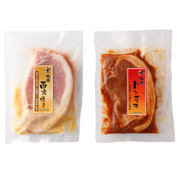 京都唯一の銘柄豚「京都ぽーく」を使った下味つきのロース肉のセット。西京焼きは京都の老舗・石野味噌の西京味噌を使用。トンテキはごはんに合うポークステーキ。特製ソースに漬け込み、幅広い世代に好まれる味つけにしています。解凍後、フライパンで焼いてどうぞ。