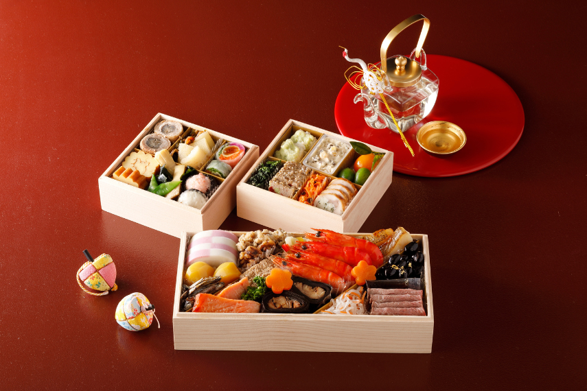 市松かまぼこ/栗きんとん/田作り/たたきごぼう/かつおくるみ/はな切り大根のはりはり漬/カラスガレイ西京焼/鶏松風/浜汐海老/菜の花/梅花人参/鰊昆布巻/銀鮭西京焼/金箔黒豆/紅白なます/ローストビーフ(ソース付)