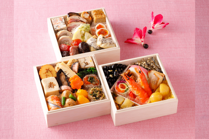 金箔黒豆/アーモンド入り田作り/栗きんとん/数の子入り松前漬/紅白かまぼこ/カラスガレイ西京焼/浜汐えび/彩りきぬた巻/くるみのかつお和え