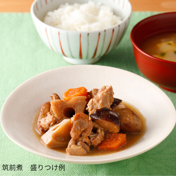 - [筑前煮]野菜(たけのこ、人参、ごぼう、れんこん)、鶏肉 (国産)、昆布かつおだし、醤油、清酒、砂糖、みりん、干し椎茸、(一部 に小麦・鶏肉・大豆を含む)