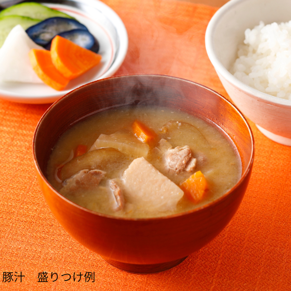 [豚汁]昆布かつおだし(国内製造)、野菜(大根、人参、 里芋、ねぎ、ごぼう)、豚肉、味噌、(一部に豚肉・大豆を含む)