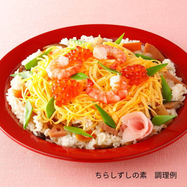 [ちらしずしの素]野菜(人参、れんこん、かんぴょう)、砂糖(国内製造)、醸造酢(米酢、りんご酢)、醤油、発酵調味料、椎茸だし、かつお昆布だし、食塩、干し椎茸、(一部に小麦・りんご・大豆を含む)