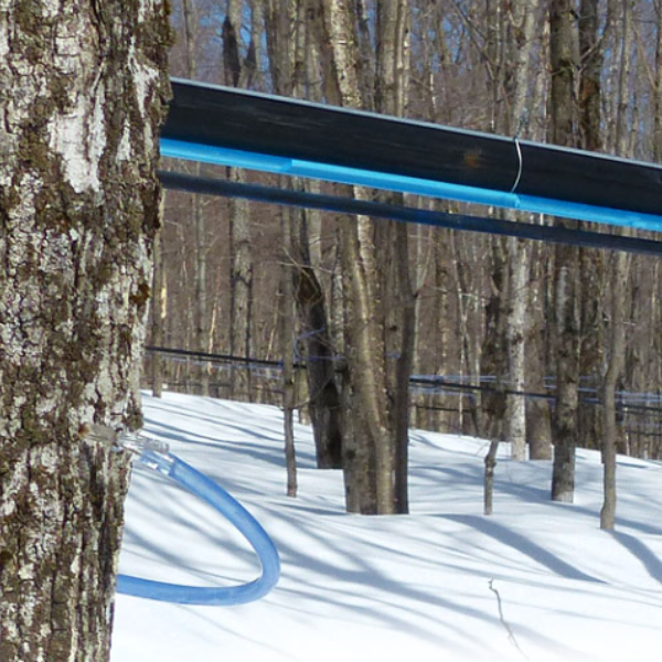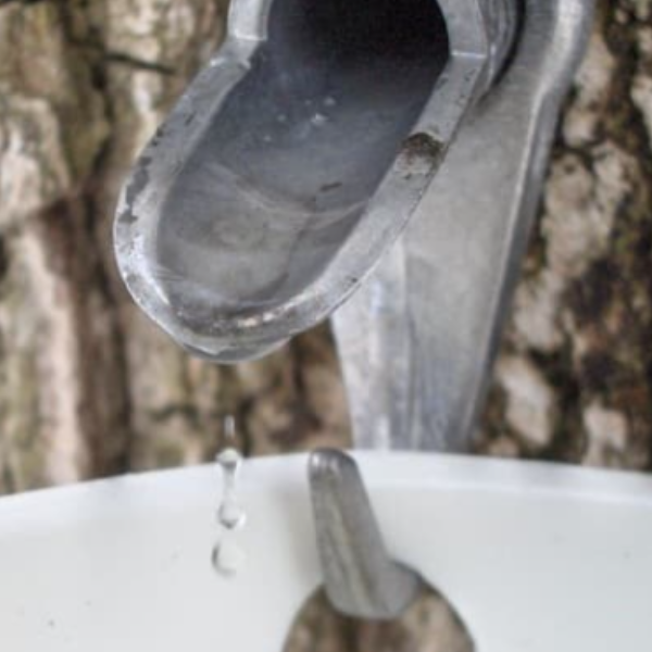 砂糖カエデの樹液「メープルサップ」を採取できるのは、2月末から3月はじめのわずかな期間だけ。幹にタップ(蛇口)を取り付けると、樹液が流れ出します。この樹液をゆっくりと丁寧に煮詰めて作られるのがメープルシロップです。