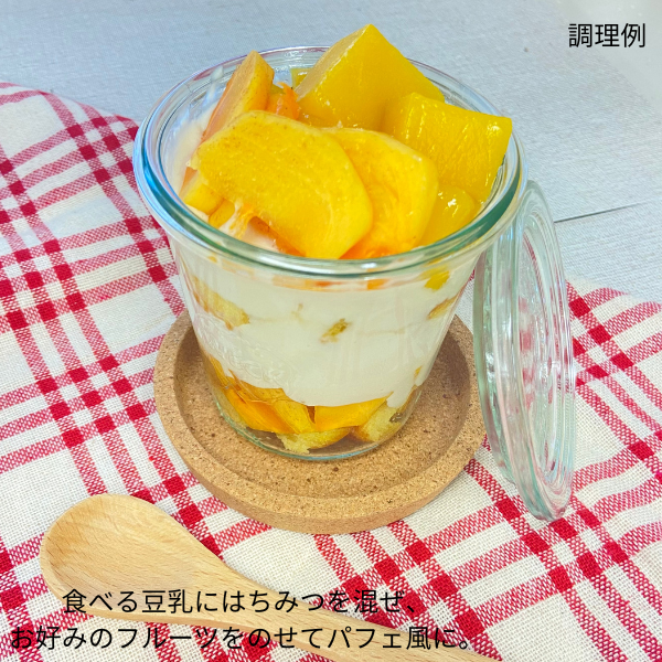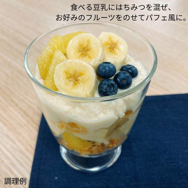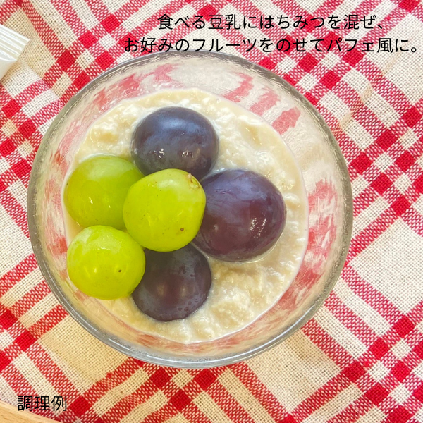 国産大豆フクユタカだけで作った豆乳。ごくごく飲むタイプではなく、とろみがあってスプーンで食べるような形状で、醤油をかけてもよし、メープルシロップや黒蜜をかけてスイーツとしてもよし。これまでにない味わいでふんわりおいしく、毎日の食卓に取り入れてほしい一品です。