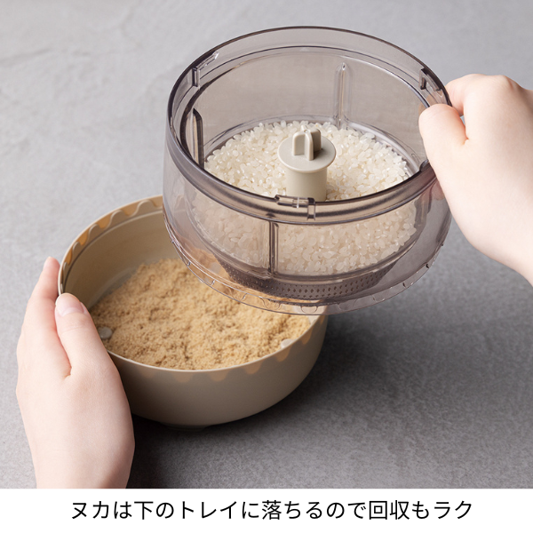 精米後は、取り除いたヌカもラクに回収できる分離式。[バスケット]、[ぬか受けトレイ]、[羽根]はすべて取り外して水洗いができます。