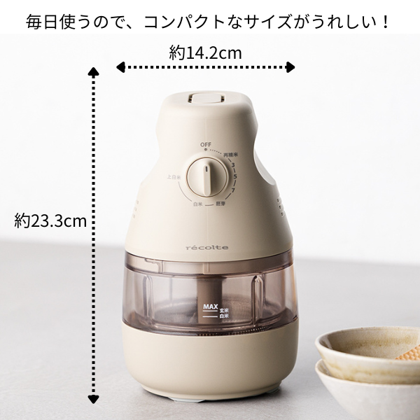 直径15cm以下、サイズもコンパクトで軽量。スペースの限られたキッチンにも置きやすい、2合サイズの小型精米機です。