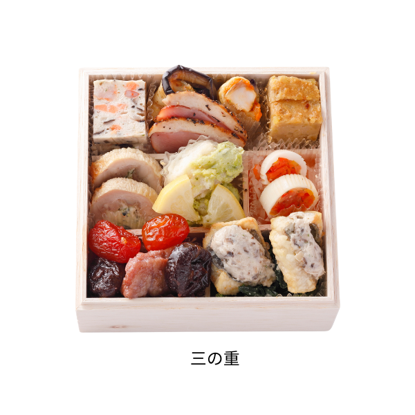 伊達巻/ぶりの子煮/山形県産きのこの松風/寿高野豆腐/海老椎茸/身欠きにしん昆布巻/竹の子土佐煮/わかめ出汁漬/梅花人参/菜の花福良漬/山形牛旬菜巻/えびときびなごの手綱巻/蓮根入りつくねの照り煮/いんげん/松笠いか雲丹焼/ちりめん青菜炒め煮
