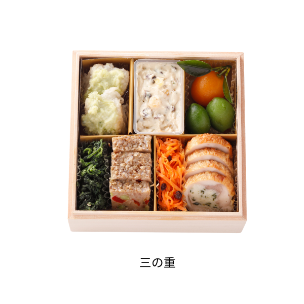 市松かまぼこ/栗きんとん/田作り/たたきごぼう/かつおくるみ/はな切り大根のはりはり漬/カラスガレイ西京焼/鶏松風/浜汐海老/菜の花/梅花人参/鰊昆布巻/銀鮭西京焼/金箔黒豆/紅白なます/ローストビーフ(ソース付)