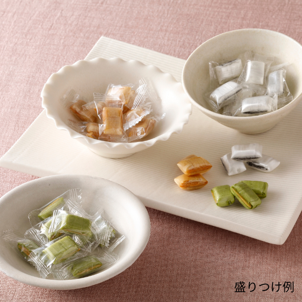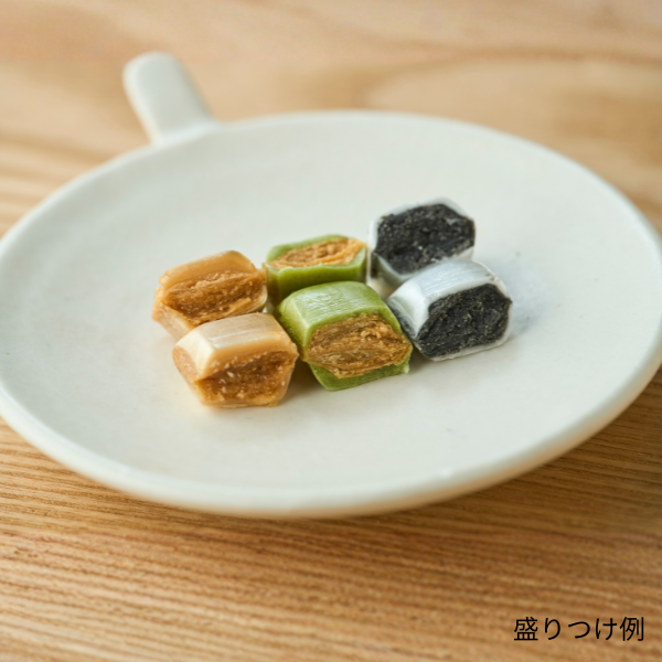有平糖は、砂糖に水あめを加えて煮詰めた飴で、金平糖とともに16世紀に日本に入ってきた歴史ある飴菓子。歯ごたえさくさくなのにやわらかく、お茶請けにぴったり。今回は3つの味をご紹介します。小さな飴にそれぞれの個性が詰まっていて、噛むとサクッと香ばしさが広がります。