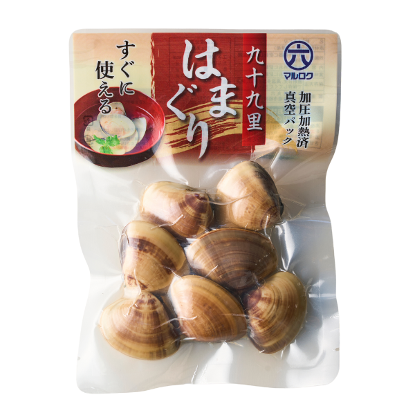 千葉県九十九里浜産のはまぐりを、砂抜き後加熱殺菌してパックしました。沸騰したお湯にそのまま入れて、塩や醤油で味を調えたら「はまぐりのすまし汁」が完成。常温保管できるので、常備しておくと便利です。