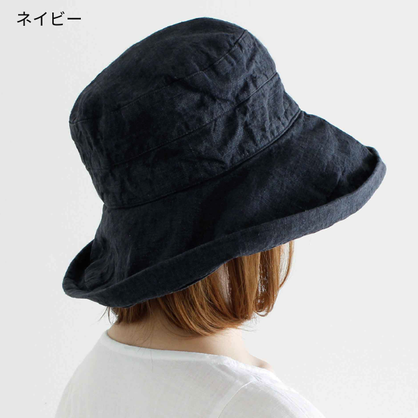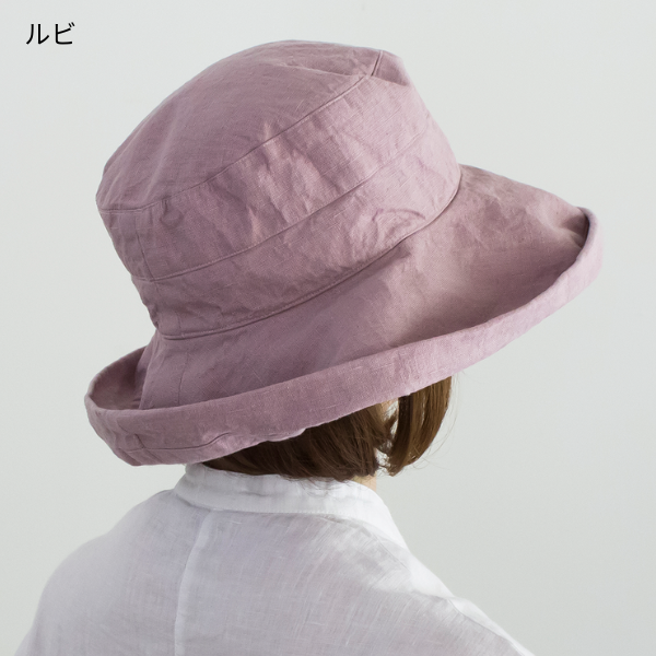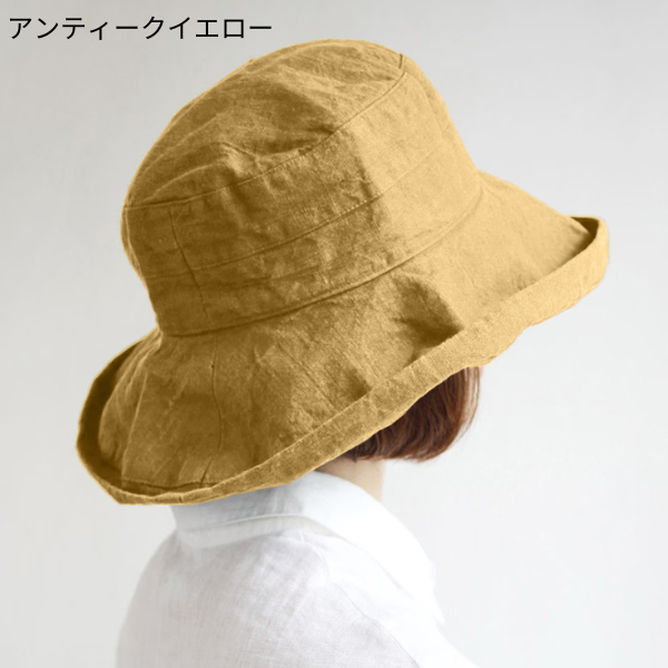 大人気のリネン素材の帽子に、新色のネイビー・アンティークイエロー・ルビが仲間入り。つばが12cmと広く、顔まわりから首の後ろまで、日差しをしっかりカバー。通気性よく蒸れにくいので、行楽のおともに、毎日の散歩やガーデニングに、これからの季節も大活躍します。エレガントな雰囲気ですが、カジュアルな服にも似合い、上品にスタイルアップ。つばを折り曲げれば変化をつけて楽しめます。折りたためるので、持ち運びにも便利。